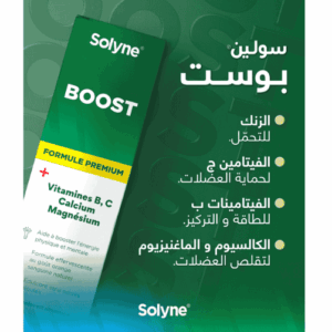 Solyne BOOST Comprimés Effervescent B/10 Comprimés Solyne Boost est une formule nouvelle , riche et unique , destinée à apporter les vitamines (complexe B et vitamine C) et minéraux (Magnésium, Zinc , calcium) qui agissent en synergie pour apporter à l’organisme l’énergie nécessaire au quotidien pour maintenir une forme physique et des fonctions intellectuelles au...