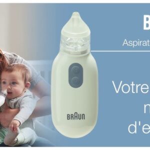 BRAUN Aspirateur nasal 1 Conçu par une marque établie qui fabrique des produits fiables, Braun Mouche-bébé 1 vous aide à décongestionner le nez de votre enfant. Notre mouche-bébé électrique propose deux niveaux d’aspiration, le plus bas étant spécialement conçu pour les nouveau-nés, et est équipé de deux embouts nasaux: l’un pour la surface, l’autre pour une meilleure...