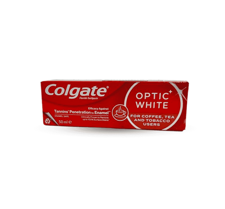 Colgate Optic White, le dentifrice idéal pour les amateurs de café, de thé et les fumeurs. Ce dentifrice convient à un usage quotidien, respecte l'émail et sa formule fluorée offre une protection contre les caries. Il élimine jusqu'à 5 fois plus de taches externes qu'un dentifrice classique. Son efficacité est cliniquement prouvée contre les taches de café, de thé et de tabac, même celles ayant pénétré le vitré de la dent. Il est cliniquement prouvé qu'il élimine jusqu'à 100 % des taches externes après deux semaines d'utilisation régulière.