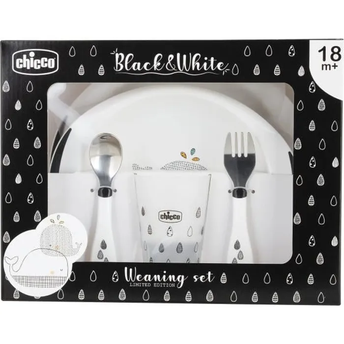 Le Chicco Black & White Coffret Repas +18m Baleines est décoré de jolis motifs de baleines et comprend tout le nécessaire pour les repas de bébé : un ensemble d'assiettes plate et creuse, un ensemble de couverts en inox et un gobelet. Garantis 0% BPA, ces produits sont conformes à la réglementation en vigueur.