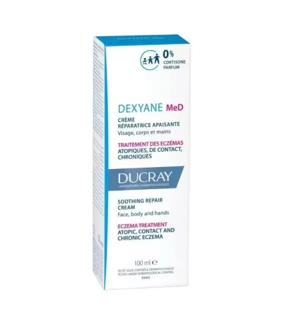 La crème réparatrice apaisante DEXYANE MeD est un dispositif médical qui traite et favorise la disparition des lésions d'eczéma atopique, de contact ou chronique et limite leur réapparition• Elle apaise les démangeaisons et diminue l'intensité des signes inflammatoires d'eczéma localisés sur le corps, le visage ou les mains• Peut être utilisé seul, en association ou en relais des dermocorticoïdes DEXYANE MED crème réparatrice apaisante, est un dispositif médical de classe CE. Lire attentivement les instructions figurant dans la notice. Ne pas utiliser sur la femme enceinte ou allaitante, sur les muqueuses, sur la zone du siège des enfants porteurs de couches. Éviter tout contact direct avec les yeux.