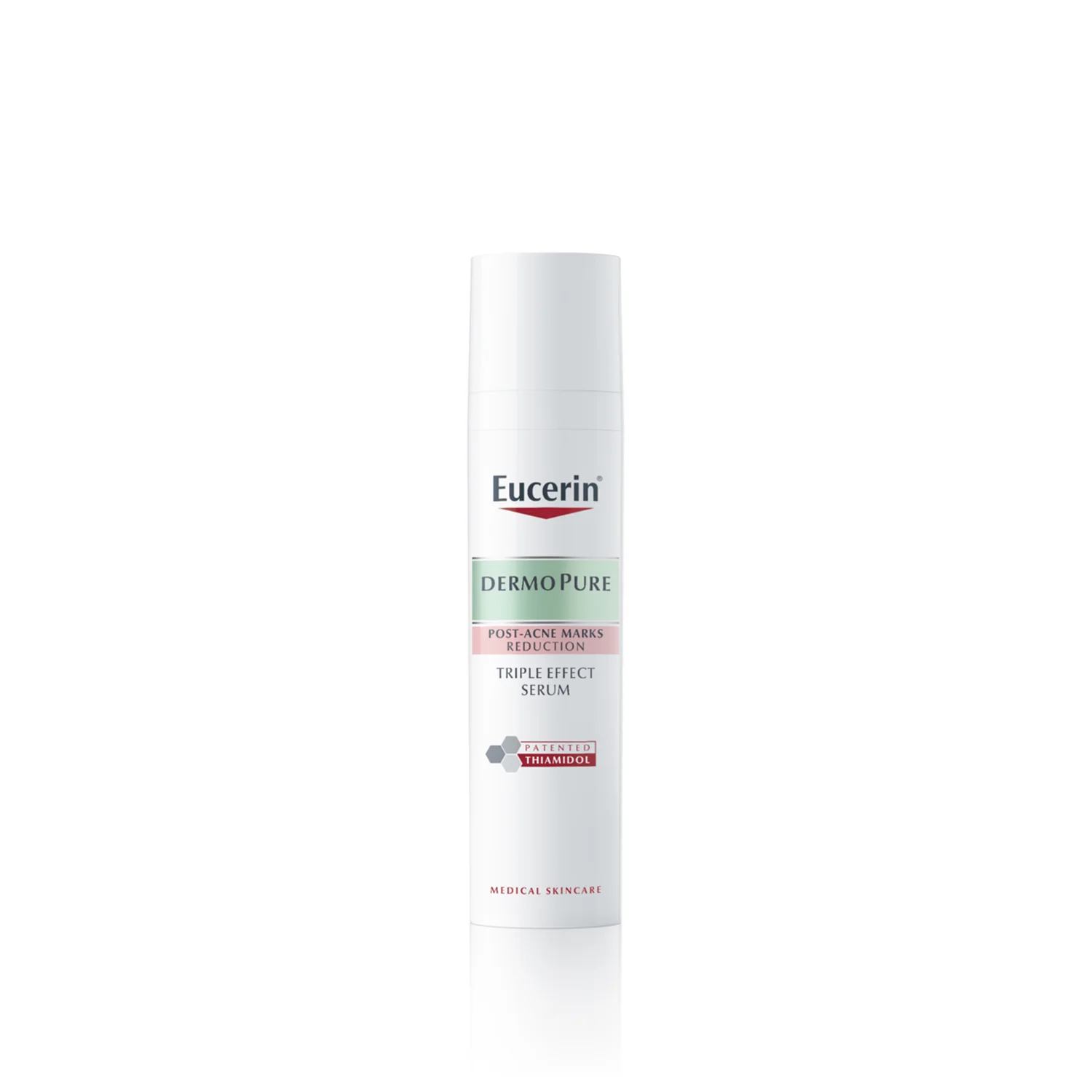 Dermopure Sérum Triple Action de Eucerin est un soin concentré formulé pour combattre les marques post-acné, les imperfections et pour diminuer la brillance. Il contient du Thiamidol breveté qui aide à réduire les marques post-acné persistantes (hyperpigmentation post-inflammatoire) et permet de prévenir leur réapparition. De l'Acide Salicylique qui réduit les imperfections de manière efficace et la Licochalcone A, anti-inflammatoire, pour prévenir leur réapparition. Sa texture légère et délicatement parfumée ne colle pas ni ne laisse de film gras sur la peau. Sa formule est également garantie non-comédogène et n'obstrue pas les pores.