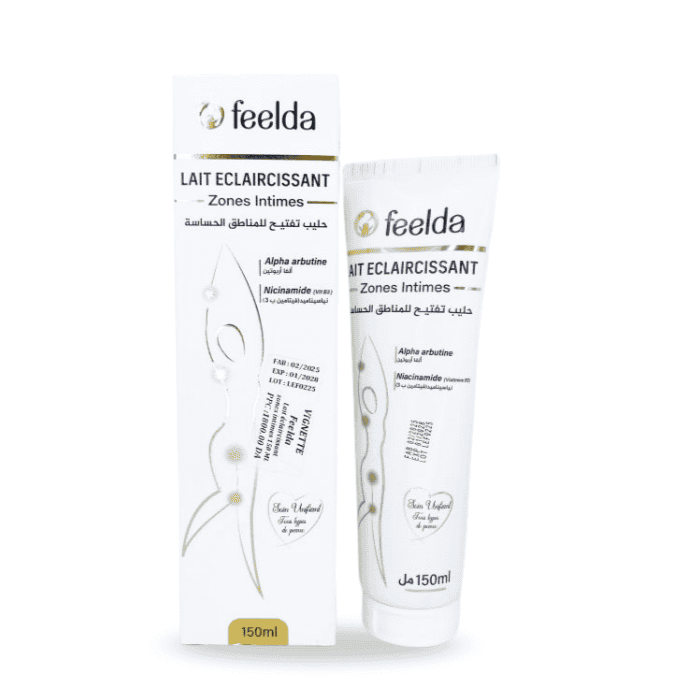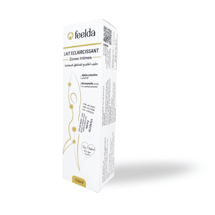 Feelda Lait Éclaircissant : Un lait éclaircissant enrichi en Alpha arbutine et niacinamide, spécialement conçu pour unifier le teint des zones sensibles comme les aisselles, les coudes, les genoux et les parties intimes. Grâce à ses actifs puissants, il aide à réduire l’hyperpigmentation tout en préservant l’hydratation naturelle de la peau.