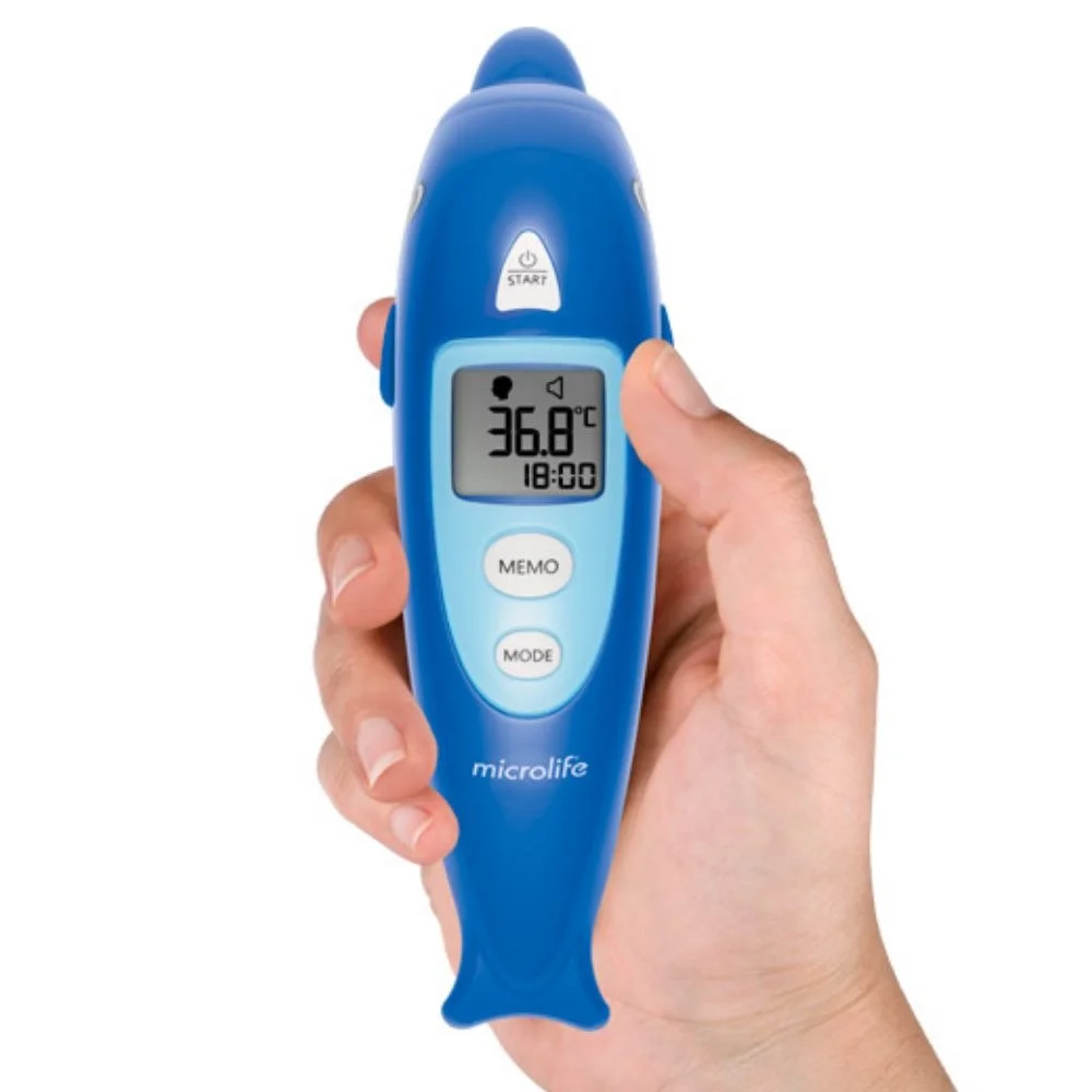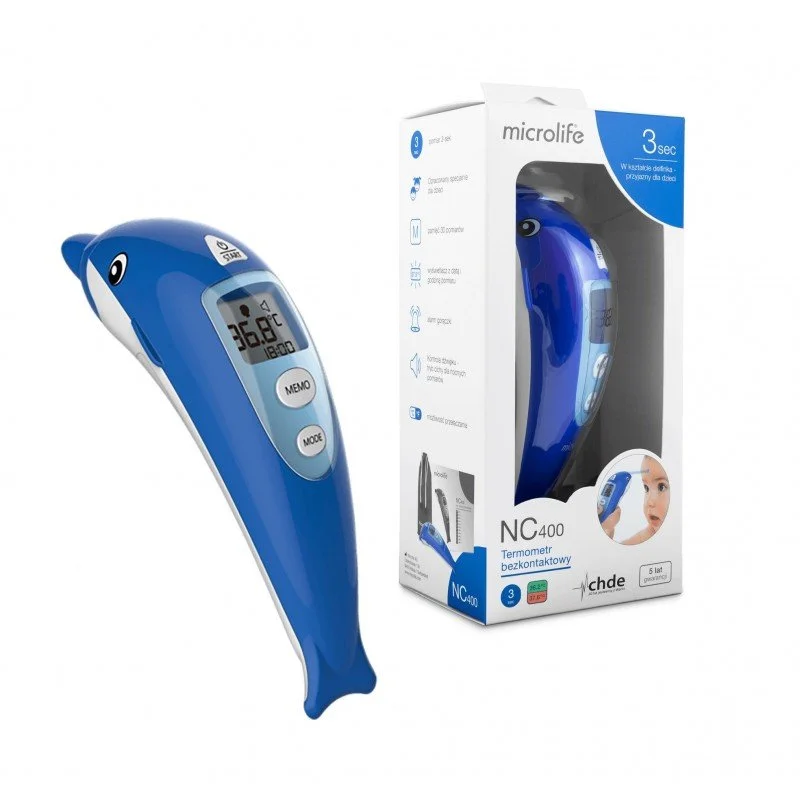 Le nouveau thermomètre sans contact Microlife NC 400, outre sa fiabilité, sa précision et sa facilité de manipulation, permet une mesure douce et non invasive de la température corporelle sans toucher le patient. Le design unique du dauphin a été spécialement conçu pour rendre la mesure plus agréable pour les enfants.