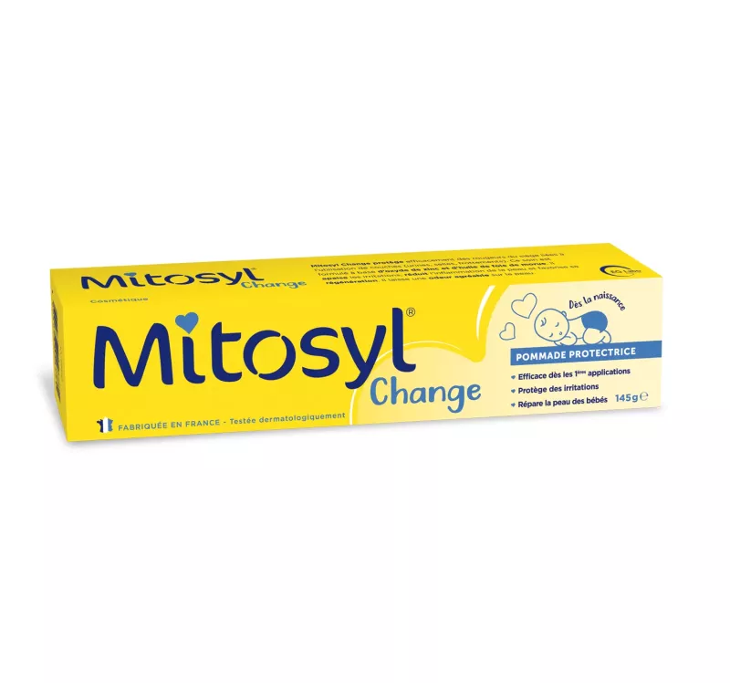 Mitosyl® Change Pommade Protectrice est la crème de change incontournable pour apaiser, protéger et prévenir les rougeurs du siège chez le nourrisson. Formulée avec de l’oxyde de zinc et de l’huile de foie de morue riche en vitamines A et D, elle agit dès les premières applications pour calmer les irritations et soutenir la régénération de la peau. Testée dermatologiquement et fabriquée en France, cette pommade douce et légèrement parfumée est parfaitement adaptée à la peau fragile des bébés, dès la naissance. Sans BHT ni BHA, elle est sûre, efficace et facile à appliquer grâce à son tube recyclable.