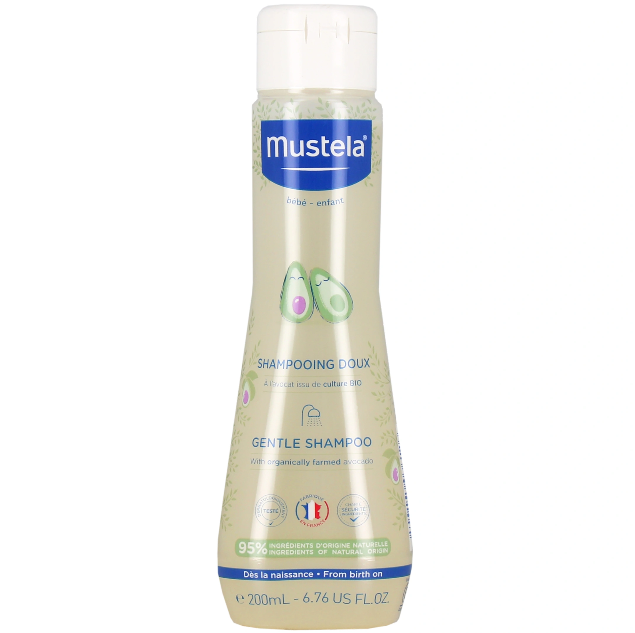 Mustela Shampooing Doux 200 ml lave et démêle efficacement les cheveux délicats de bébé dès la naissance.