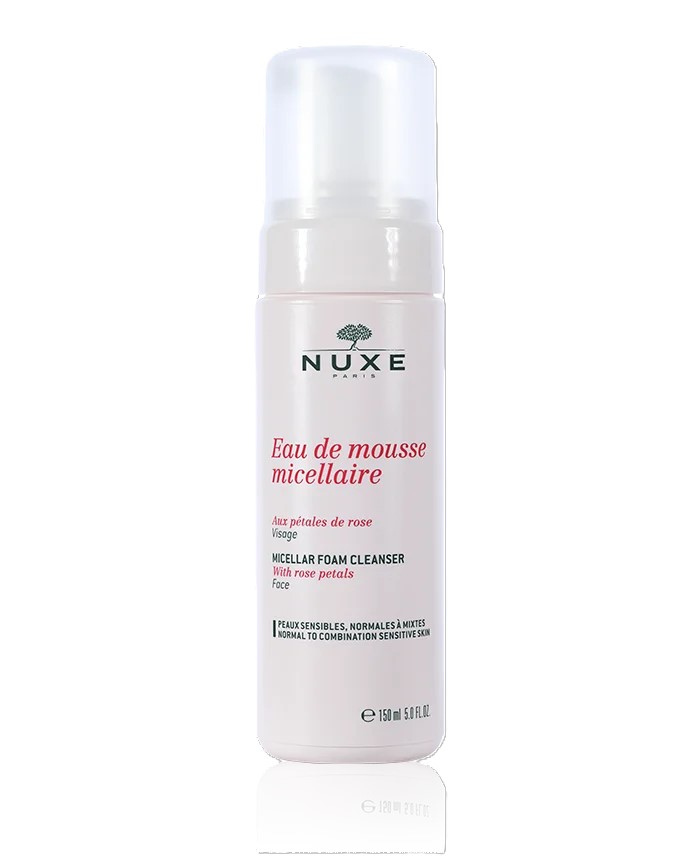 L’Eau de Mousse Micellaire aux Pétales de Rose de Nuxe nettoie le visage en douceur et laisse la peau propre, purifiée et visiblement plus belle.