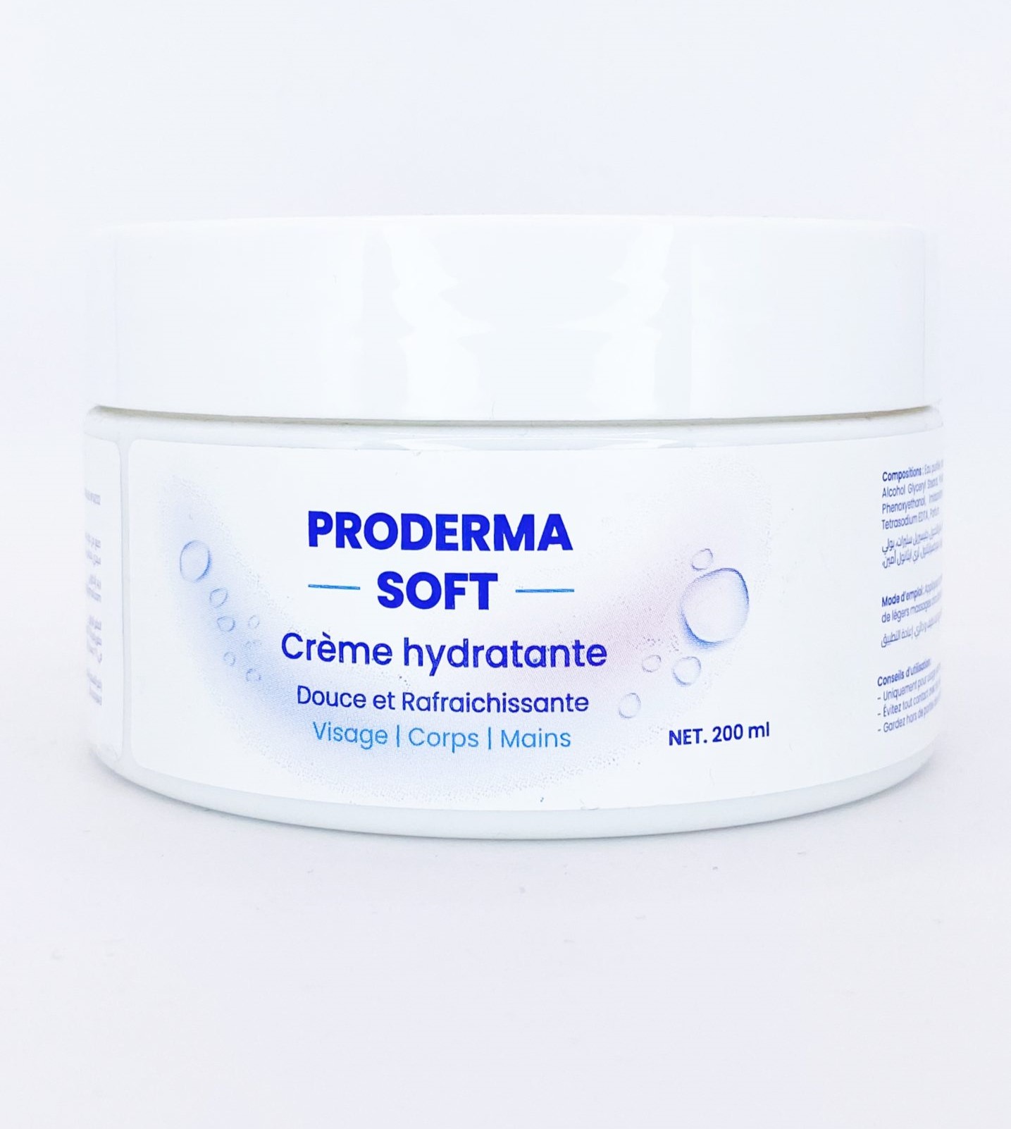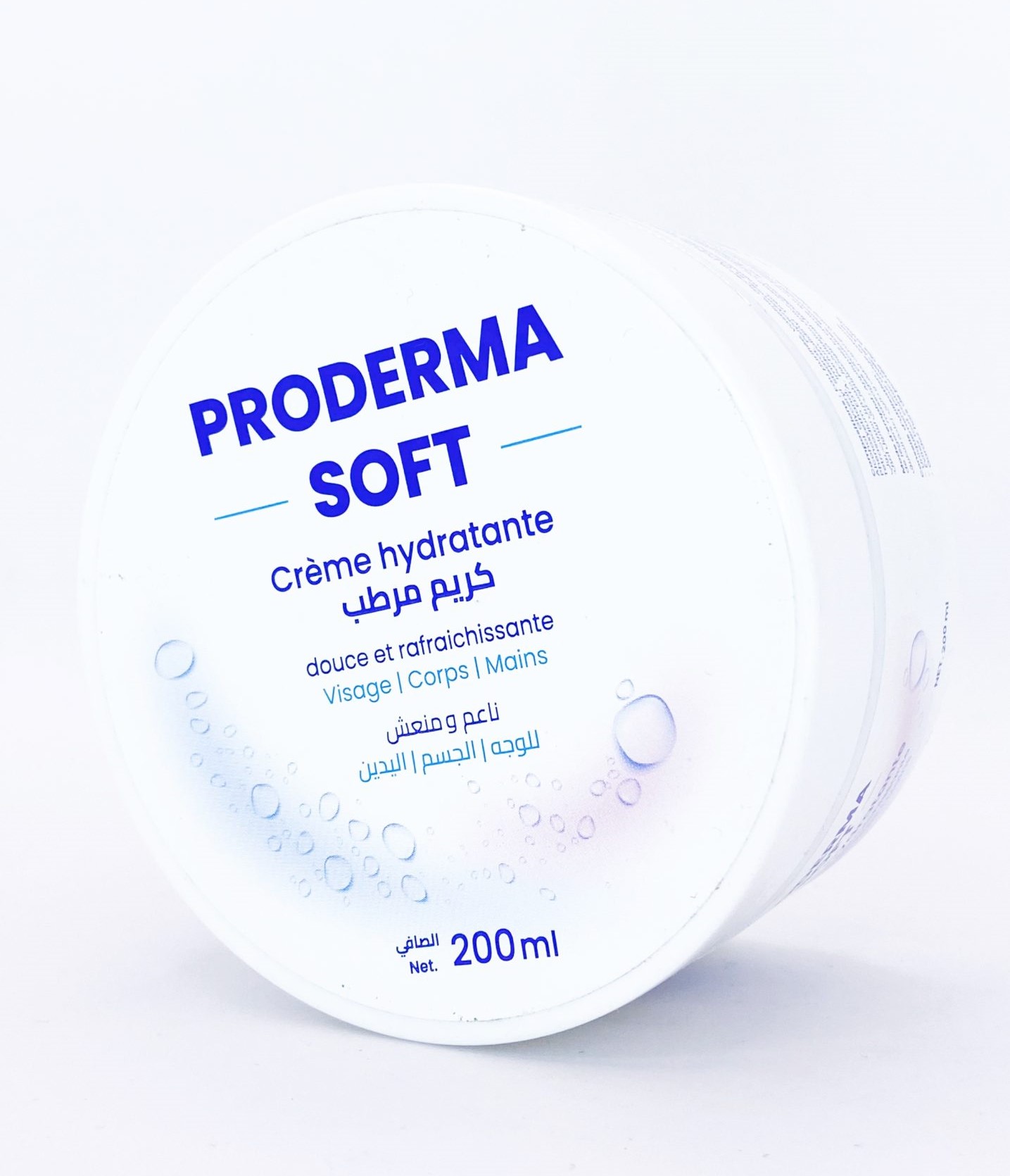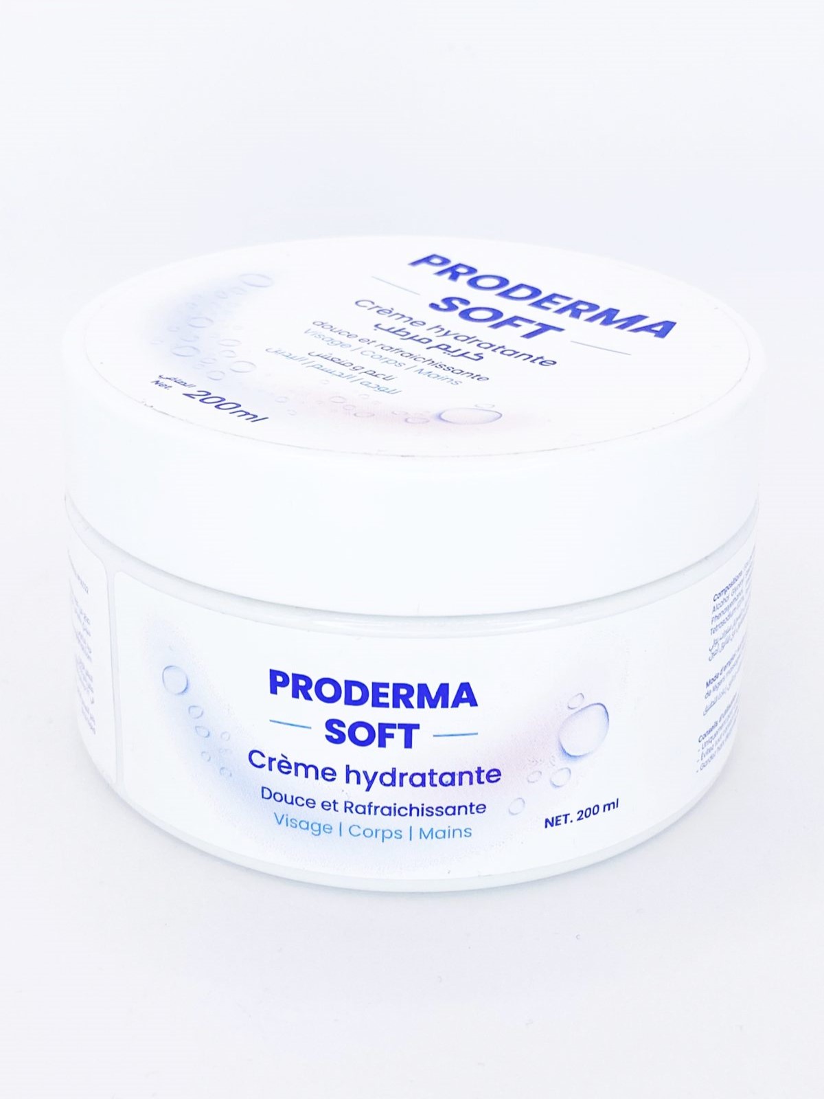 Proderma Soft Crème Hydratante – 200 ml est une crème polyvalente à la texture légère et veloutée, conçue pour hydrater et adoucir la peau du visage, du corps et des mains. Enrichie en agents émollients et rafraîchissants, elle procure une sensation immédiate de confort tout en laissant la peau souple et délicatement parfumée.