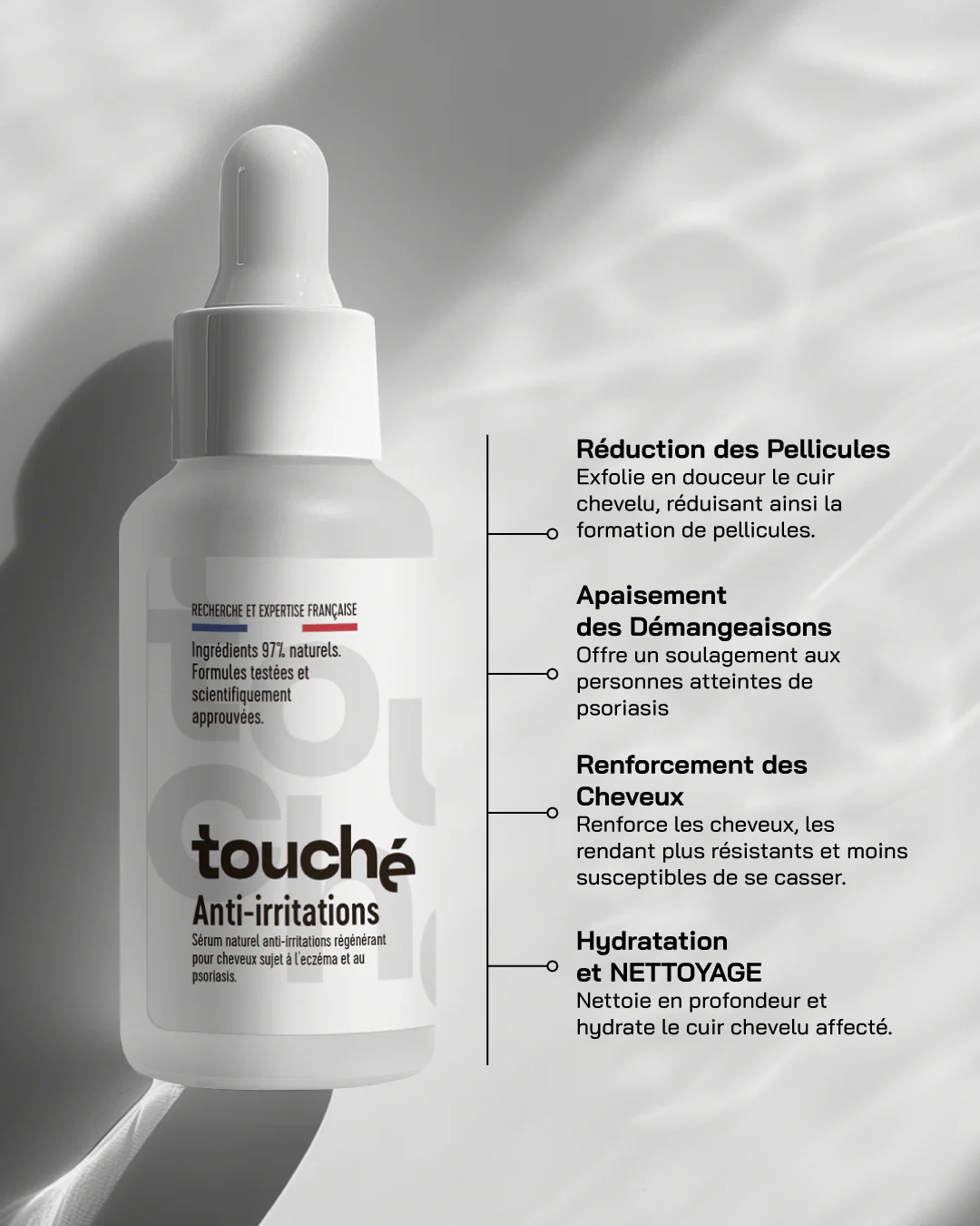Le sérum anti-irritations touché est spécialement formulé pour soulager les démangeaisons, atténuer les inflammations et améliorer l'état du cuir chevelu irrité ou sujet au psoriasis et à l’eczéma. Il contribue à restaurer le confort cutané tout en renforçant les follicules pileux. Ce soin ciblé purifie, régule la production de sébum et favorise un environnement capillaire sain, sans agresser le cuir chevelu.
