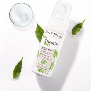 DIADERMINE Essentiel Bio Mousse démaquillante apaisante 150ML Enrichie en prébiotiques d‘origine naturelle Respecte et stimule l’équilibre naturel de votre peau et sa barrière protectrice Massez délicatement matin et soir sur peau humide et rincez à l’eau claire La peau est intensément nettoyée et apaisée, souple et sans sensation de tiraillement 99 % d’ingrédients d’origine naturelle